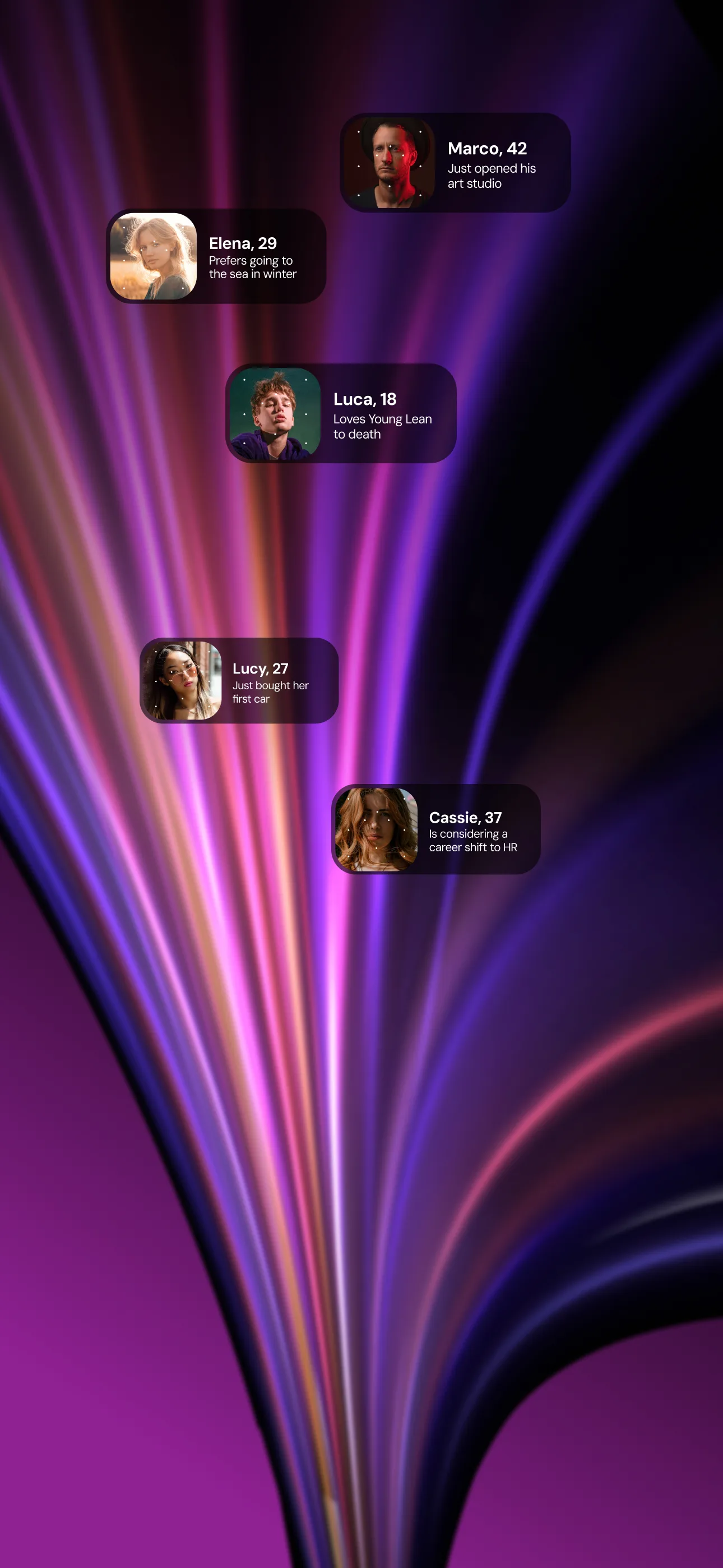 Unlock Hyper Profiling through Cognitive Footprint. Target campaigns for users interests, attention spans, life attitudes, mental habits, content preferences and purchasing patterns.